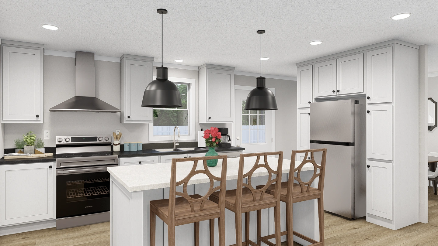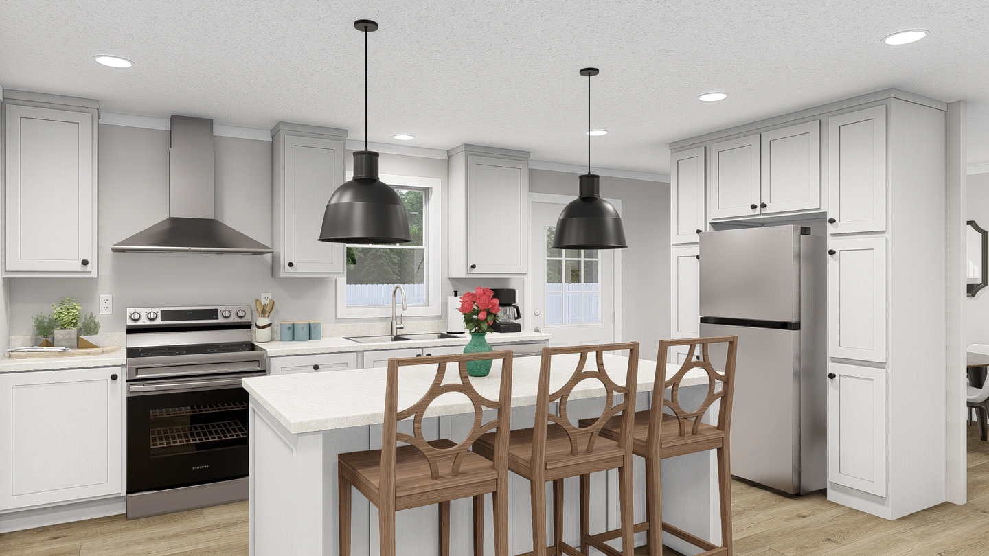 The open feel of the kitchen and living room creates an inviting area to gather with friends and family, while the extended areas have flexible nooks you could use for an office, an exercise area, a pet home, or craft station.